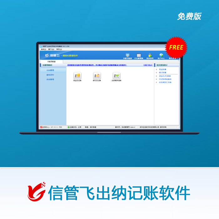 信管飛出納記賬軟件免費(fèi)版(出納軟件免費(fèi)版),適合小企業(yè)、店鋪、家庭、個(gè)人記賬,操作簡(jiǎn)便方便,可拷貝到U盤運(yùn)行。系統(tǒng)可以有效的規(guī)范記帳業(yè)務(wù),使您能省時(shí)省力,準(zhǔn)確無誤的管理好公司財(cái)務(wù)狀況。支持仿真帳簿,可以批量輸出打印帳頁。系統(tǒng)提供了帳簿報(bào)表的各種模板,省去了手工操作的種種麻煩。 與信管飛財(cái)務(wù)出納記賬軟件收費(fèi)版相比沒有應(yīng)收應(yīng)付款管理、票據(jù)管理等功能。