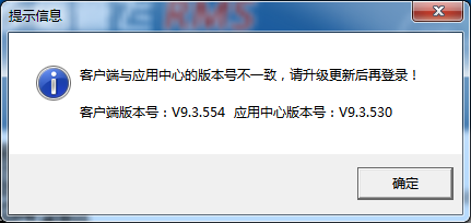 ????(4)客戶端程序登錄的時候,如果發現與主機電腦上的應用中心程序版本號不一致,會提示如下信息,用相同版本的安裝程序安裝一下即可。