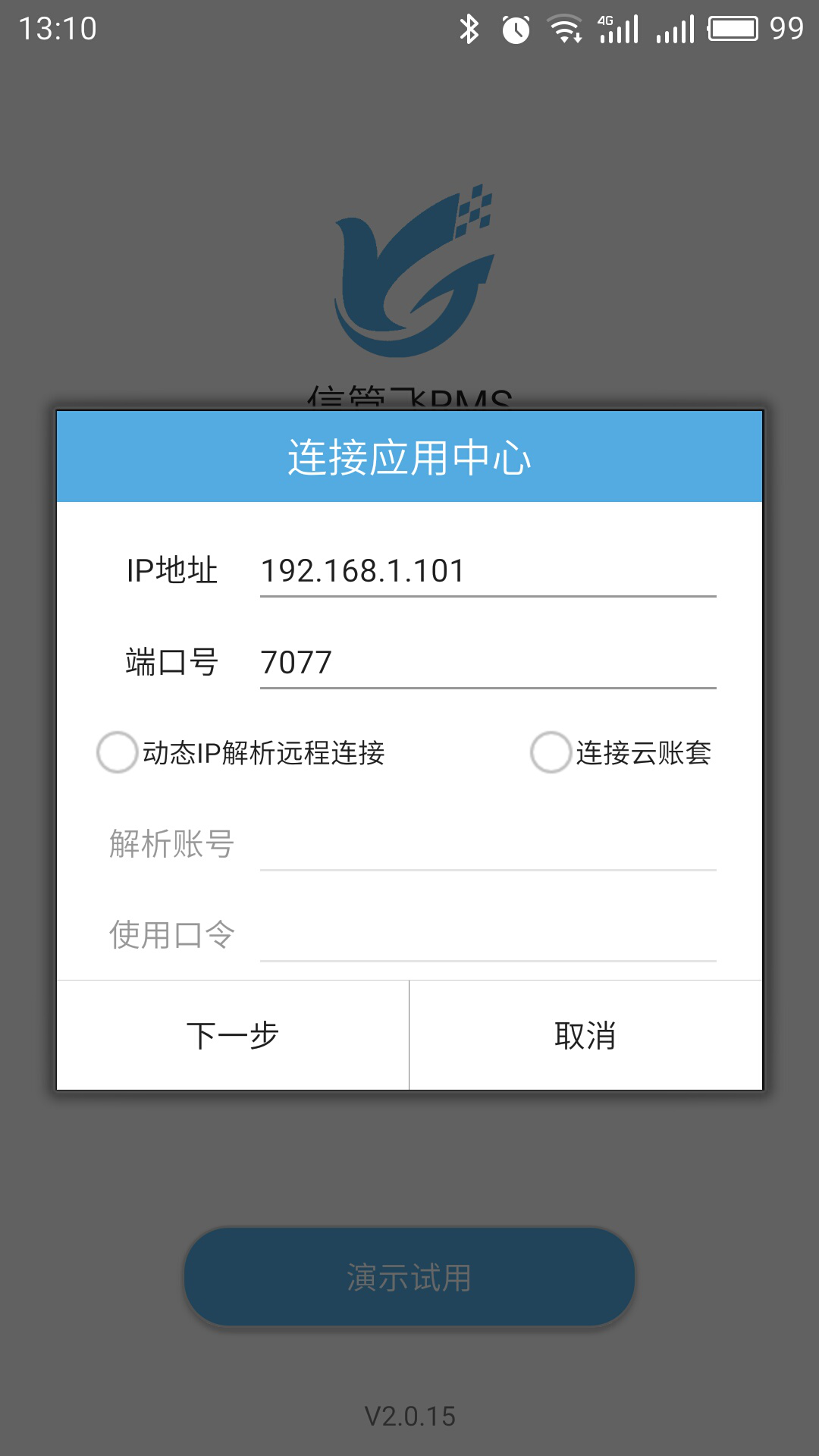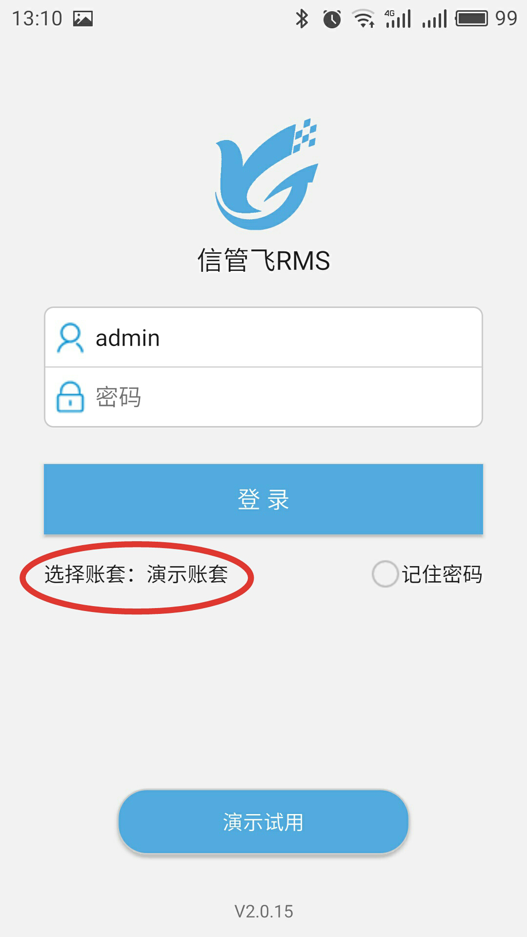 ????手機端安裝信管飛 App 后,點擊應用圖標進入登錄界面。首次使用需要點“選擇賬套”配置連接參數,與電腦端設置類似,這里不再贅述。