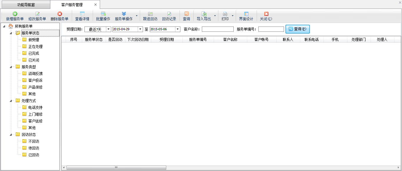 ????在功能導航窗,點“客戶關系”—》“客戶服務管理”,即可進入客戶服務界面,如下圖所示:
