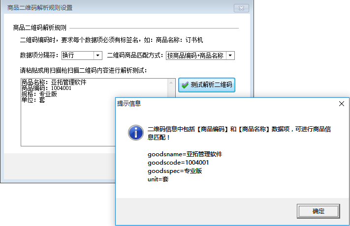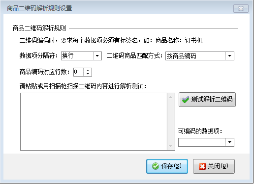 ????在功能導航窗點擊“擴展應(yīng)用”—》“商品二維碼規(guī)則”可以設(shè)置商品二維碼解析規(guī)則,其界面如下圖所示。
