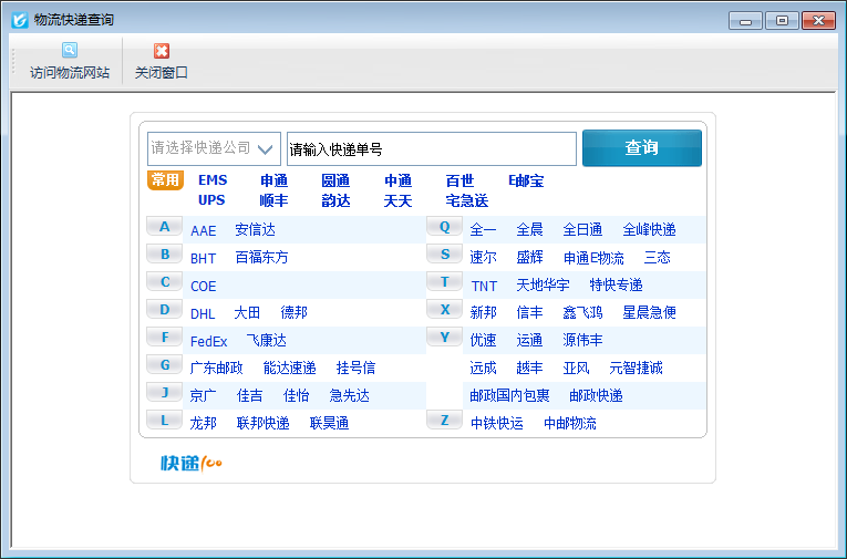 ????在功能導航窗點“擴展應(yīng)用”—》“快遞查詢”即可進入“物流快遞查詢”界面,如下圖所示: