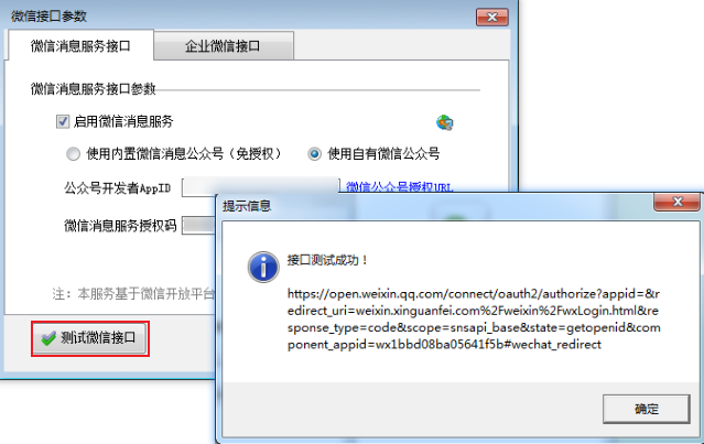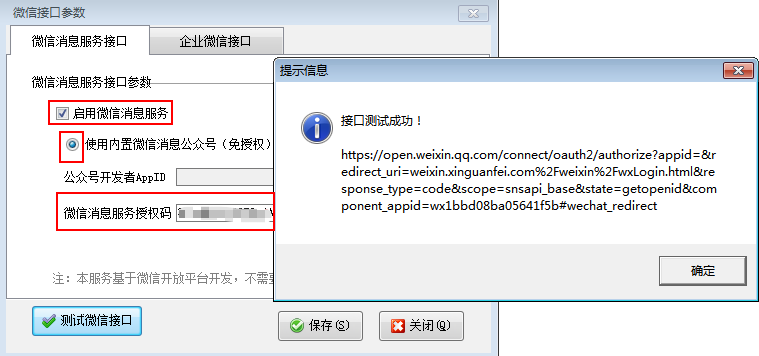????授權(quán)成功后,我們會分配微信云服務(wù)使用的期限和服務(wù)密碼。把服務(wù)密碼復制到微信接口參數(shù)中。點擊測試接口,提示“接口測試成功”則可以開業(yè)務(wù)單據(jù)推送微信消息。如下圖所示:
