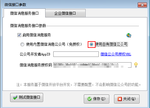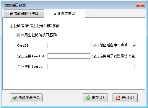 ????在功能導航窗點擊“擴展應(yīng)用”—》“微信接口參數(shù)”可以打開微信接口參數(shù)設(shè)置窗口,可以設(shè)置微信消息服務(wù)接口參數(shù)以及企業(yè)微信接口參數(shù)。