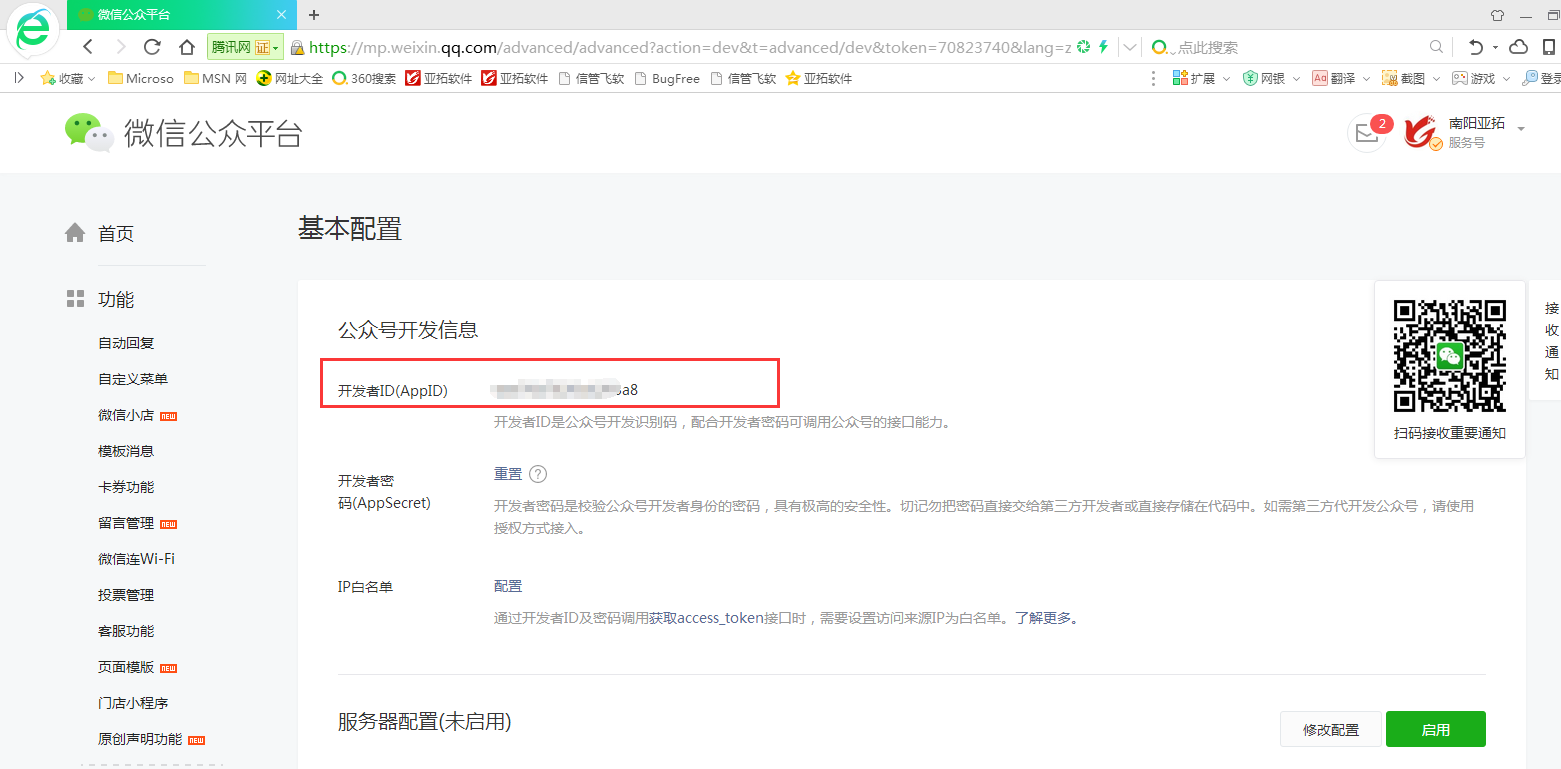 ????公眾號開發(fā)者 AppID:登錄企業(yè)微信公眾號,在微信公眾平臺的首頁導航欄下拉到最后,選擇開發(fā)模塊的“基本配置”。在基本配置中復制下“開發(fā)者 ID(AppID)”信息。如下圖所示: