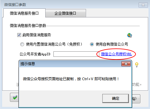 授權(quán)微信云服務(wù):把公眾號開發(fā)者 ID 信息復制到參數(shù)配置界面的公眾號開發(fā)者 AppID 中,點擊“復制微信公眾號授權(quán)頁面 URL”,提示“授權(quán)頁面地址已復制,按 Ctrl+V 即可復制粘貼使用”。如下圖所示: