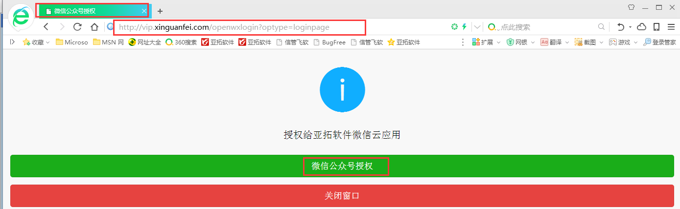 ????打開瀏覽器,在瀏覽器地址欄中按 Ctrl+V,把微信公眾號授權(quán)頁面地址復制進去,點擊確認鍵進入授權(quán)頁面,如下圖所示: