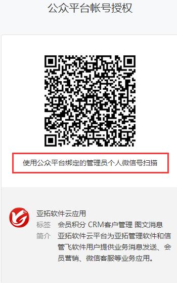 ????點擊“微信公眾號授權(quán)”會彈出公眾平臺賬號授權(quán)二維碼。使用公眾平臺綁定的管理員個人微信號進行掃描。會在手機微信上彈出一個授權(quán)確認界面,把微信公眾號授權(quán)給亞拓軟件云應(yīng)用。如下圖所示: