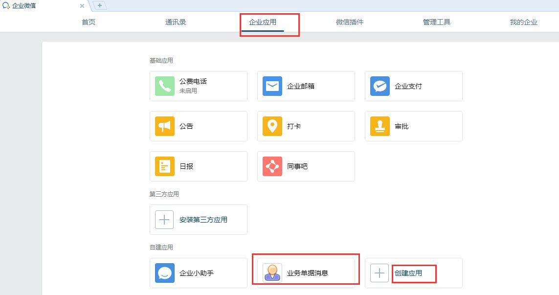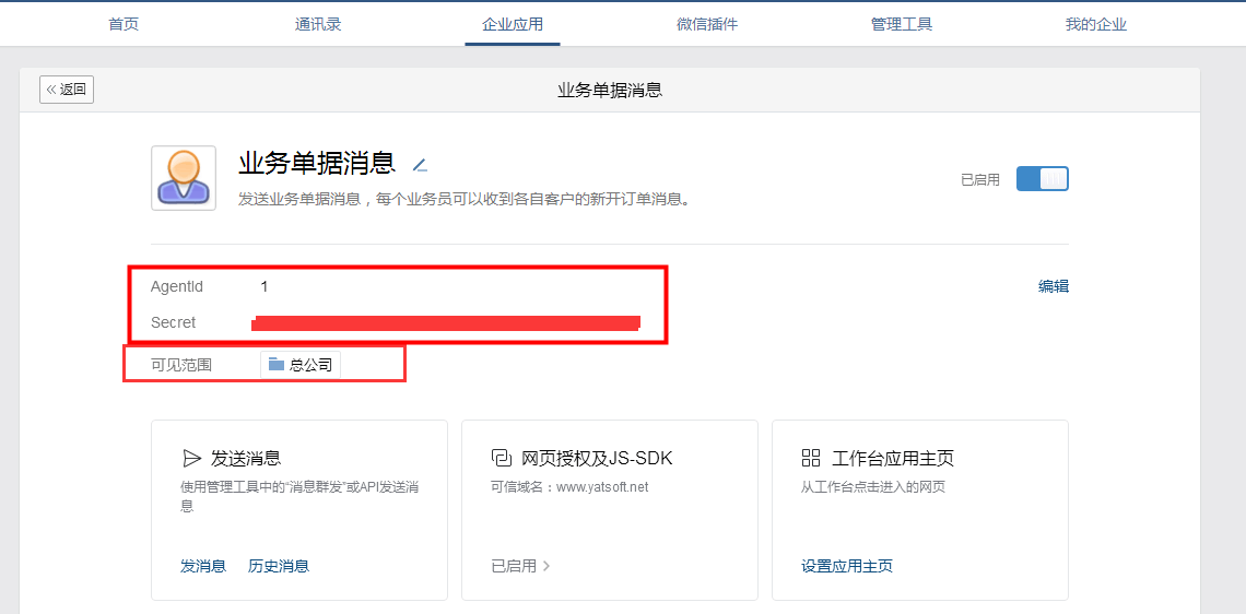 ????在企業(yè)微信“我的應(yīng)用”內(nèi)增加應(yīng)用“業(yè)務(wù)單據(jù)消息”并設(shè)置應(yīng)用可見范圍,應(yīng)用創(chuàng)建成功后,在應(yīng)用詳情界面可以查看企業(yè)應(yīng)用 Agentld 以及企業(yè)應(yīng)用 Secret,如下圖所示。