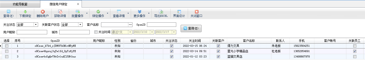 綁定操作:在工具欄點擊“綁定操作”按鈕可以對微信綁定用戶進行(取消)綁定客戶和(取消)綁定員工操作。