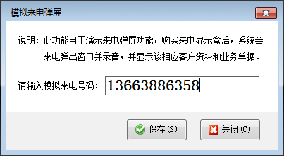 模擬來電:此功能可以實際模擬演示來電彈屏功能,在模擬來電彈屏窗口輸入模擬來電號碼,點擊“保存”后系統(tǒng)會自動彈出來電彈屏窗口,如下圖所示:
