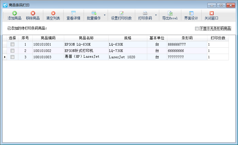 移除商品:在工具欄點擊“移除商品”按鈕,可以移除已添加到待打印商品列表內(nèi)的無需打印條形碼的商品。
