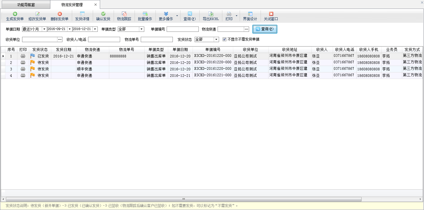查詢:可以根據(jù)單據(jù)日期、單據(jù)類型、單據(jù)編號、物流快遞、收貨單位、收貨人、電話、物流單號、發(fā)貨狀態(tài)等條件查詢發(fā)貨單。