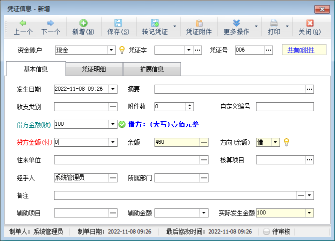 發(fā)生日期:必填項,默認為當前機器的時間。需要特別注意的是,發(fā)生日期會影響日記帳帳簿的顯示,即次序問題,如果當天一筆本應先“借”(收入)的憑證后錄入,就有可能會導致當天的余額為負數(shù)。當然,這不會影響帳戶的余額。