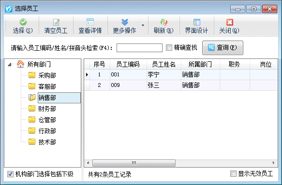 經(jīng)手人:必填項,點擊選擇經(jīng)手人按鈕,彈出“選擇員工”窗口,如下圖所示: