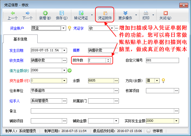 憑證附件:點擊“憑證附件”按鈕,可掃描或?qū)肱c憑證相關的電子文件。如下圖所示: