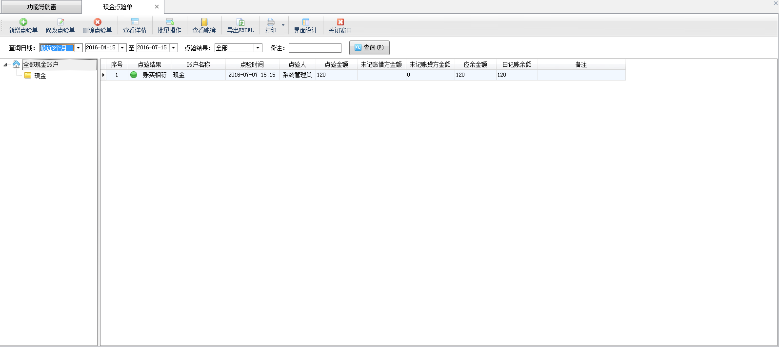 ????在功能導航窗,點擊“出納管理”—》“現(xiàn)金點驗單”,即可進入“現(xiàn)金點驗單”界面,如下圖所示: