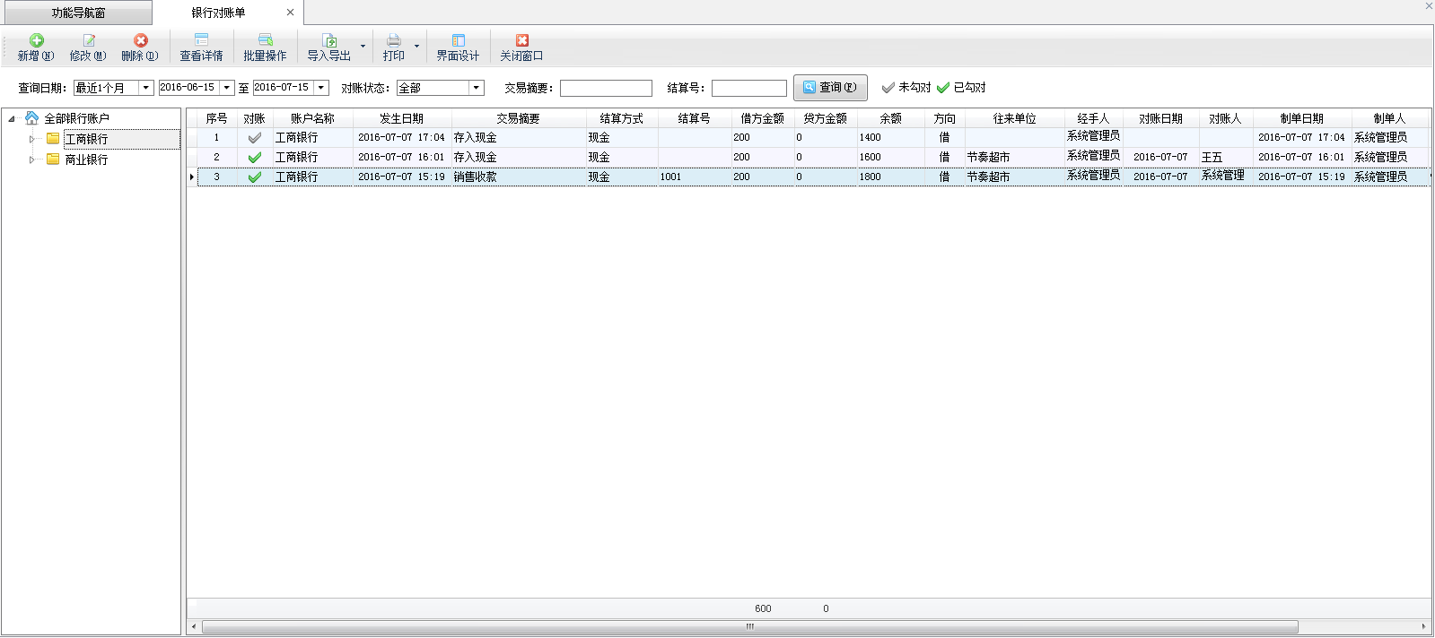 4 | 銀行對帳單勾對(對帳)及取消勾對 | 在銀行對賬單列表中,選擇一個銀行對賬單,可以點擊“勾對(對賬)”按鈕,進行對賬單勾對確認,另雙擊記錄可以快速進行勾對。點擊“取消勾對”可以取消勾對。點擊“查看對賬單”按鈕可以查看對賬單詳細信息。 |