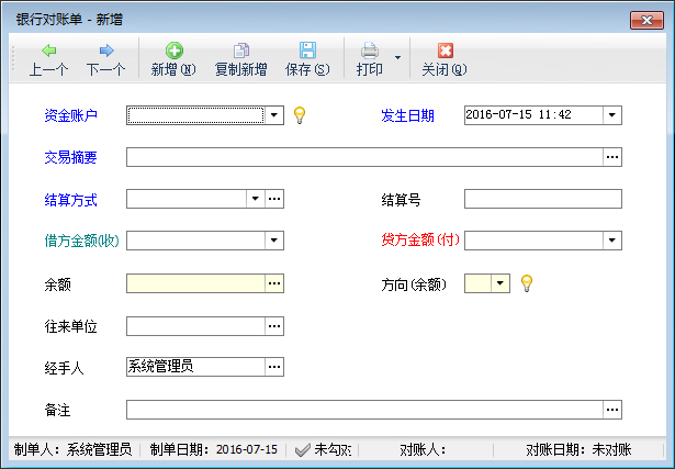 ????在工具欄中點擊“新增”按鈕,系統(tǒng)彈出“新增銀行對賬單”窗口,用戶錄入銀行對賬的相關數(shù)據(jù)項,如下圖所示: