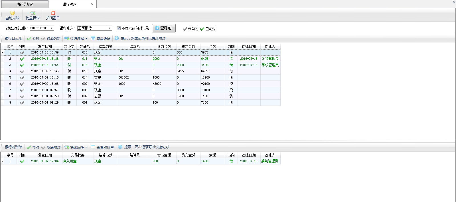 1 | 自動對賬 | 點擊工具欄中的“自動對賬”按鈕,系統(tǒng)會彈出“自動對賬”窗口,設置對賬起始日期及對賬選項后點擊“開始勾對”即可,詳細操作見下文描述。 |
