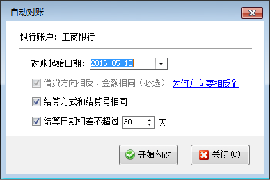 ????在工具欄中點擊“自動對賬”按鈕,系統(tǒng)彈出“自動對賬”窗口,選擇對賬起始日期及相關選項后,點擊“開始勾對”按鈕即可,如下圖所示: