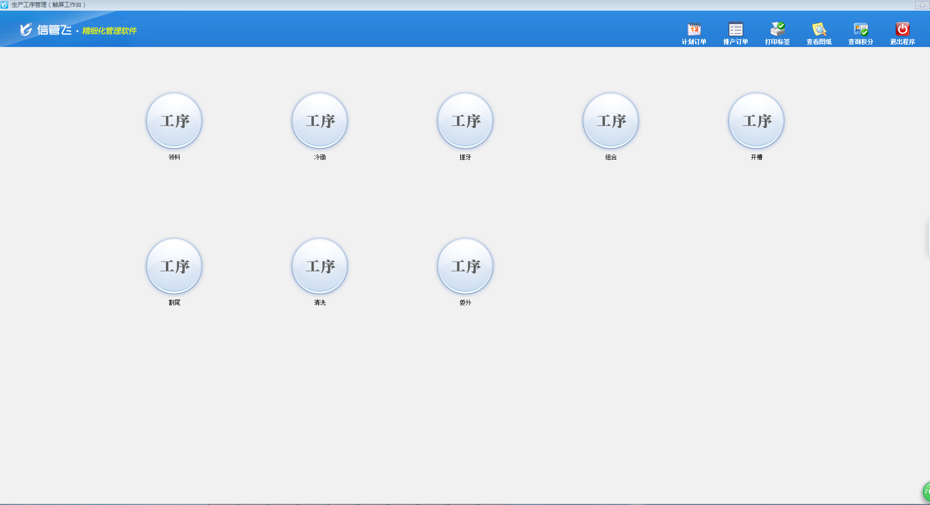 ????在功能導(dǎo)航窗點(diǎn)擊“生產(chǎn)管理”—》“生產(chǎn)工序管理”,即可進(jìn)入生產(chǎn)工序管理(觸屏工作臺)界面(如下圖所示),此觸屏工作臺界面可操作的工序請在功能導(dǎo)航窗點(diǎn)擊“績效考核”—》“績效考核項目”中進(jìn)行設(shè)置。