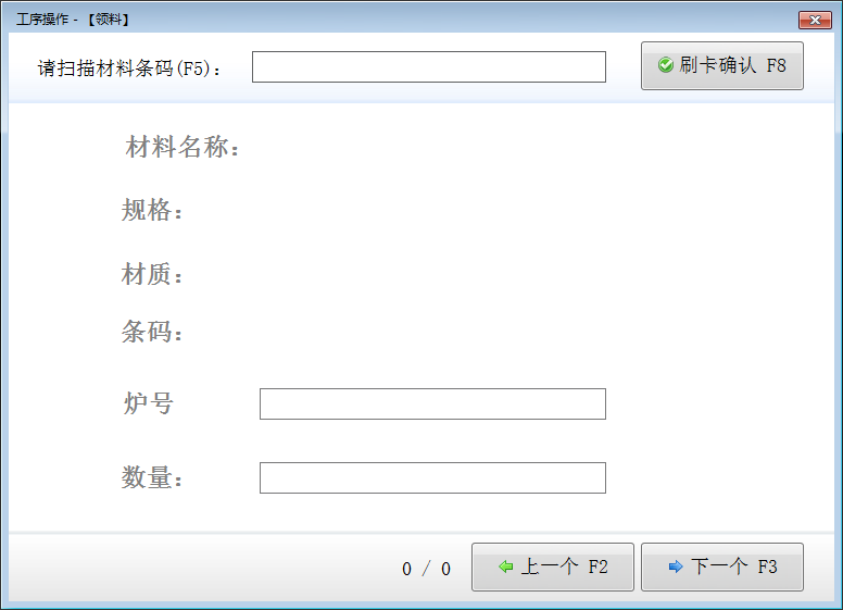 領(lǐng)料操作:點(diǎn)擊“工序(領(lǐng)料)”可以打開領(lǐng)料操作窗口,請掃描或者輸入原材料條碼選擇原材料,輸入領(lǐng)料數(shù)量并刷卡確認(rèn)領(lǐng)料。