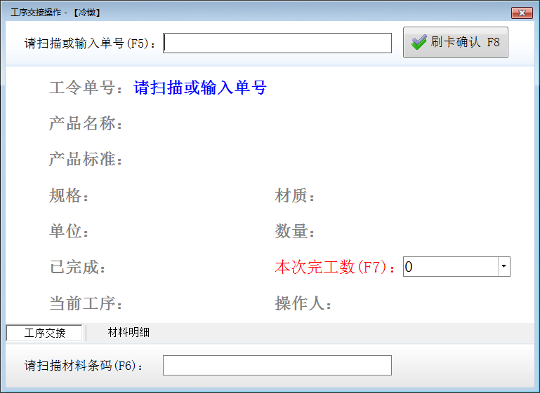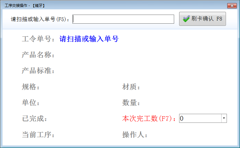 工序交接操作:冷鐓、搓牙、組合、開槽、割尾、清洗、委外為工序交接操作,操作人員選擇相應(yīng)工序可以打開此工序交接操作窗口,請掃描或輸入工令單單號選擇工令單,輸入本次完工數(shù)量后進(jìn)行刷卡確認(rèn)工序交接,如圖所示。