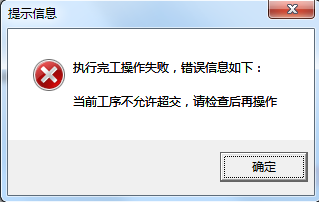????如當(dāng)前工序設(shè)置不允許超交 ,則“完工數(shù)量”不能大于“計劃數(shù)量”,如果輸入的“完工數(shù)量”大于“計劃完成數(shù)量”,系統(tǒng)會彈出提示信息:“執(zhí)行完工操作失敗,當(dāng)前工序不允許超交,請檢查后再操作”。