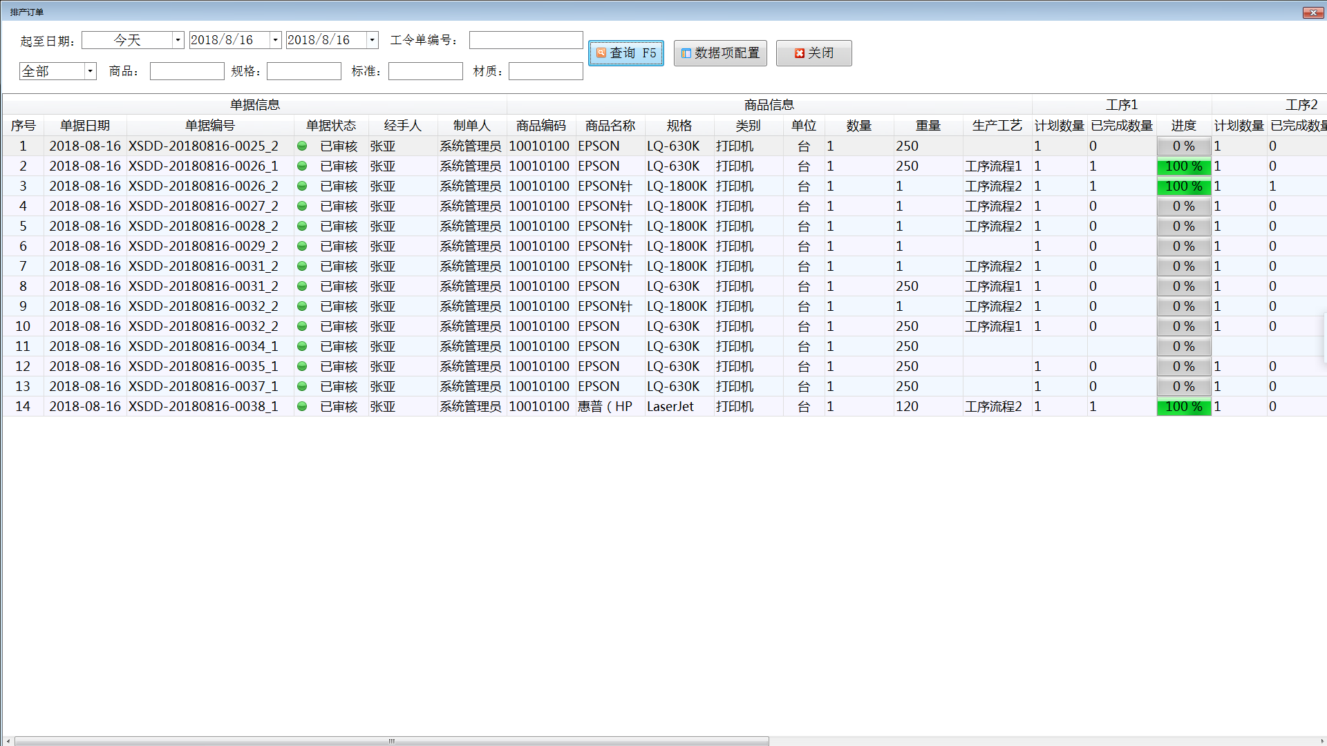 排產(chǎn)訂單:點(diǎn)擊“排產(chǎn)訂單”按鈕可以打開排產(chǎn)訂單窗口,可以根據(jù)日期、工令單編號、訂單類型(計劃訂單、標(biāo)準(zhǔn)訂單)、商品名稱、規(guī)格、標(biāo)準(zhǔn)、材質(zhì)查詢排產(chǎn)訂單的各工序生產(chǎn)完成情況。點(diǎn)擊“數(shù)據(jù)項配置”按鈕可以打開數(shù)據(jù)項配置窗口,可以配置列表顯示數(shù)據(jù)項。