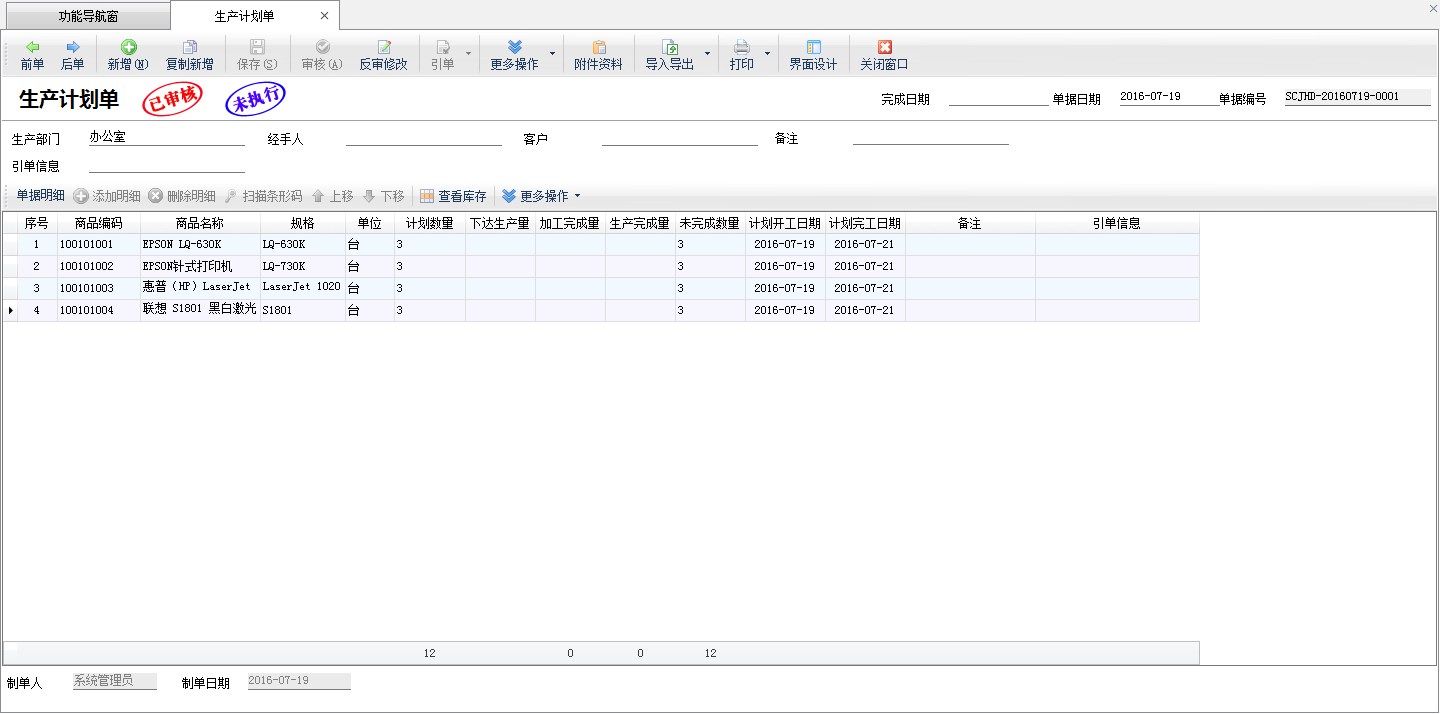????(1)未執(zhí)行:新增加的生產(chǎn)計劃單,處于“未執(zhí)行”狀態(tài)。