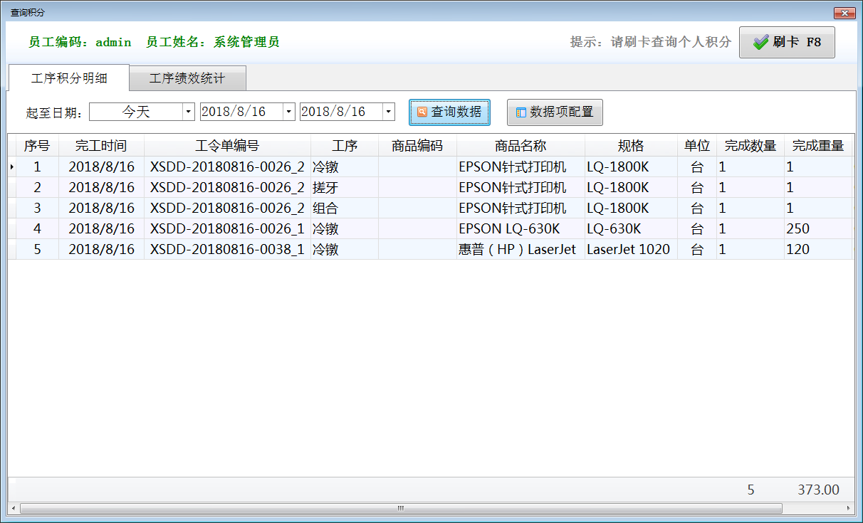 查詢積分:點(diǎn)擊“查詢積分”按鈕可以打開查詢積分窗口,請刷卡查詢個人積分,可以根據(jù)日期范圍查詢個人工序積分明細(xì)及工序績效統(tǒng)計積分。