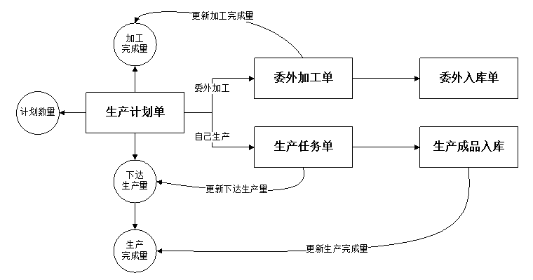 ????② 生產(chǎn)計劃明細(xì)中只能輸入計劃數(shù)量(即計劃生產(chǎn)數(shù)量),其他數(shù)量由后續(xù)單據(jù)執(zhí)行后自動更新。下圖為不同業(yè)務(wù)單據(jù)更新相應(yīng)數(shù)量示意圖: