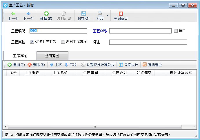 新增:點(diǎn)擊“新增”按鈕,可以新增生產(chǎn)工藝。