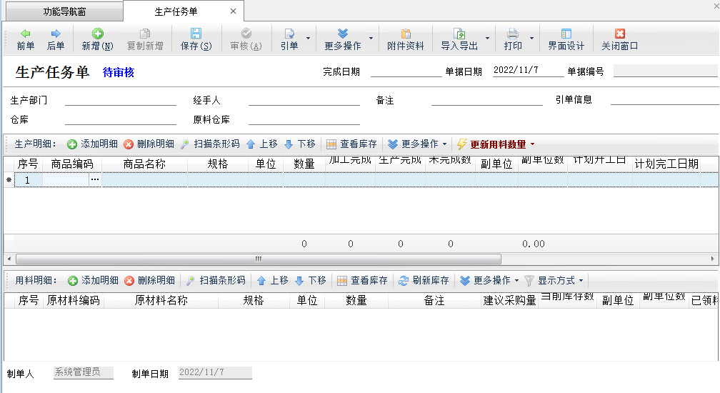 單據(jù)明細(xì):引用或輸入生產(chǎn)商品明細(xì)后,只需要錄入“數(shù)量”,其他數(shù)量由后續(xù)業(yè)務(wù)單據(jù)引用生成任務(wù)單后,自動更新。