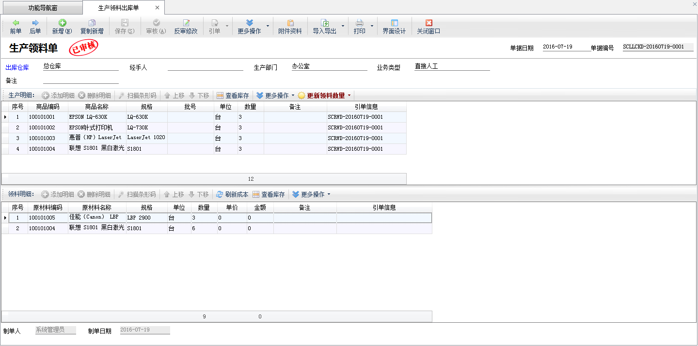 ????生產(chǎn)領(lǐng)料出庫操作說明和生產(chǎn)任務(wù)單一致,這里不再詳細(xì)介紹。