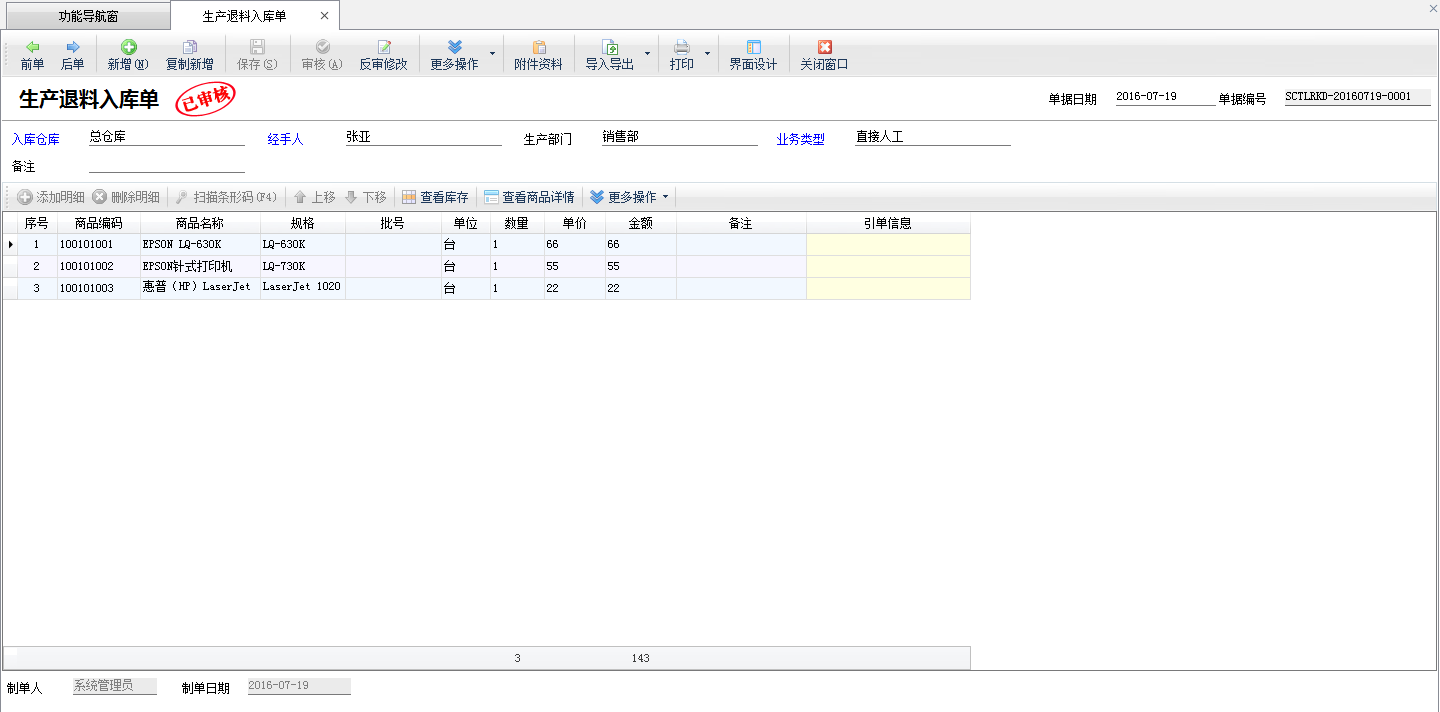 ????生產(chǎn)退料入庫單操作比較簡單,這里不再詳述。