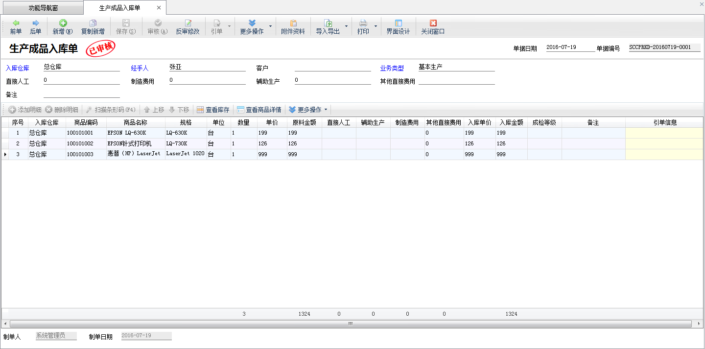 入庫倉庫:必填數(shù)據(jù)項,生產(chǎn)的產(chǎn)品將進(jìn)入這個倉庫,單據(jù)保存審核后,相應(yīng)商品的庫存數(shù)量增加。