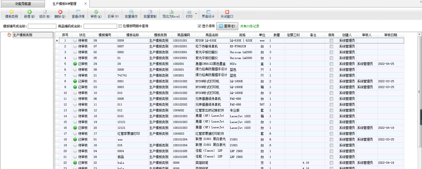 模板類別:可以維護(hù)模板類別,后續(xù)可以按照模板類別管理生產(chǎn)模板。點(diǎn)工具欄中的“模板類別”按鈕可以維護(hù)類別。