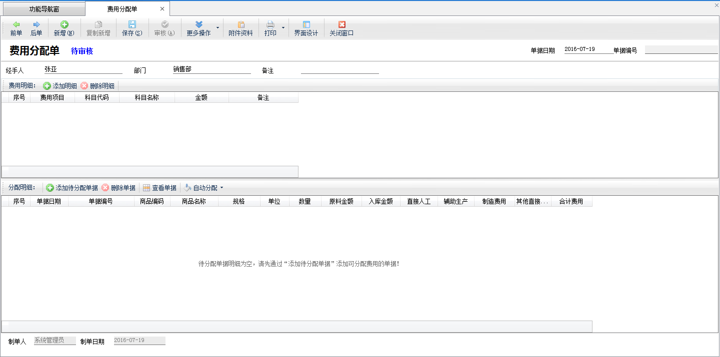 ????在功能導(dǎo)航窗,點(diǎn)“生產(chǎn)管理”—》“費(fèi)用分配單”,即可進(jìn)入費(fèi)用分配單界面,如下圖所示: