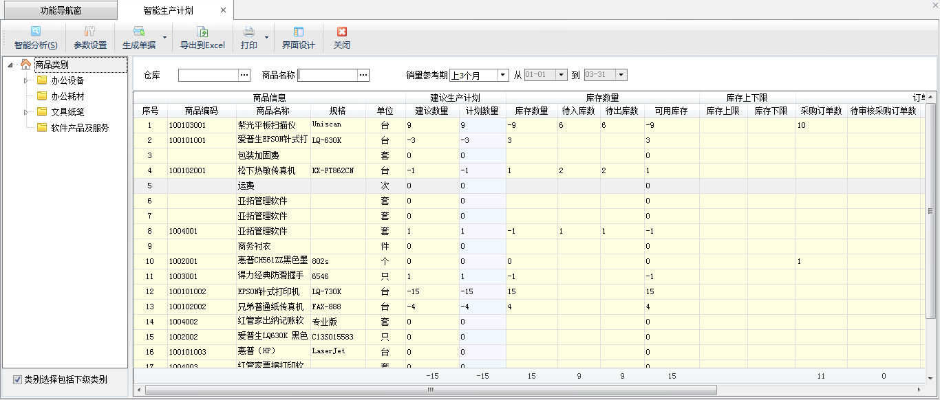 ????智能生產(chǎn)計劃可根據(jù)當(dāng)前庫存情況,并可結(jié)合庫存上下限、往年同期銷售量、銷售訂單數(shù)量、待審核數(shù)量等條件進(jìn)行組合運(yùn)算,從而給出建議的商品生產(chǎn)建議數(shù)量,并可以把建議結(jié)果生成為生產(chǎn)計劃單。