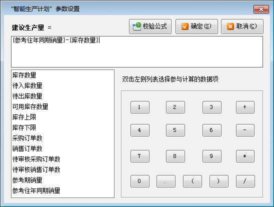 (1)參數(shù)設(shè)置:可以設(shè)置“建議生產(chǎn)量”的運(yùn)算公式,軟件將根據(jù)您設(shè)計的公式計算出建議數(shù)量。