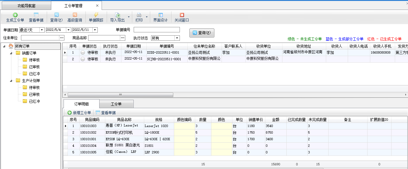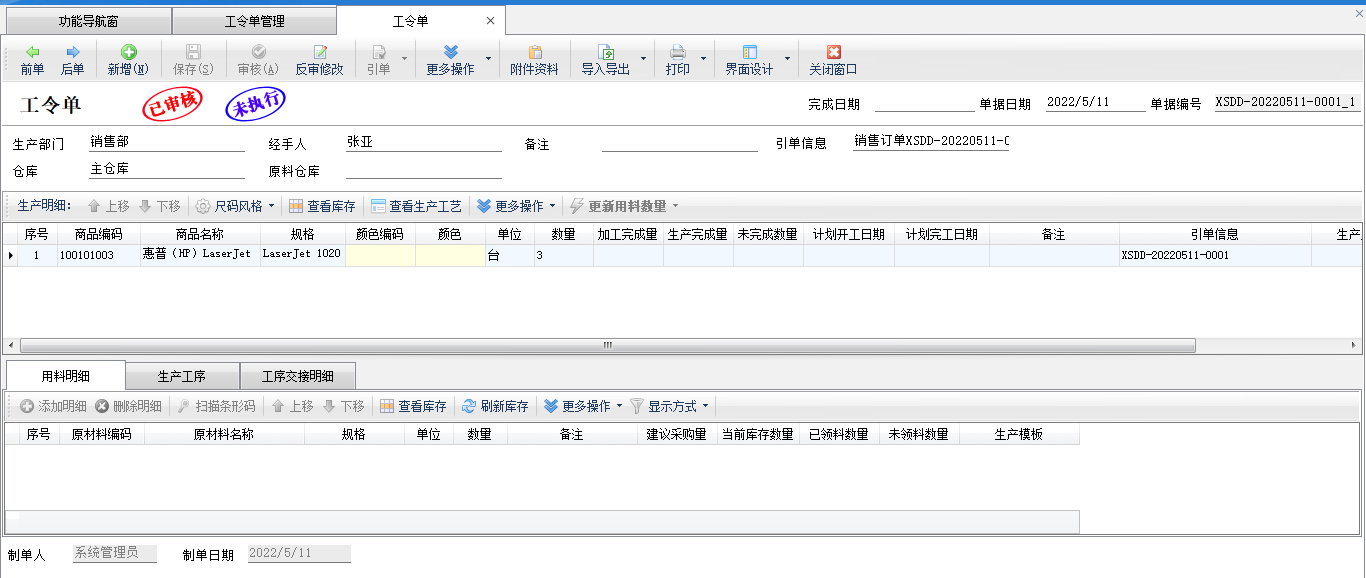 生成工令單:在工具欄點(diǎn)擊“生成工令單”按鈕可以根據(jù)已審核銷售訂單生成工令單。