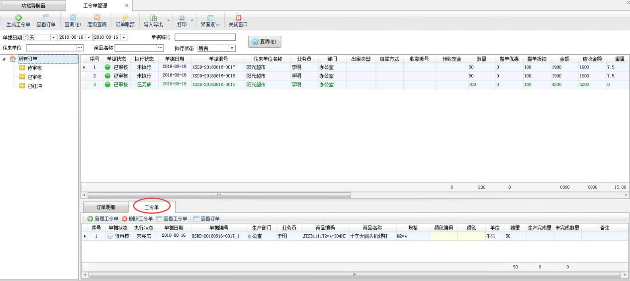 ????銷售訂單審核后,可以根據(jù)銷售訂單生成工令單,工令單審核后,可以按照工令單的生產(chǎn)工序流程對產(chǎn)品進(jìn)行生產(chǎn)。