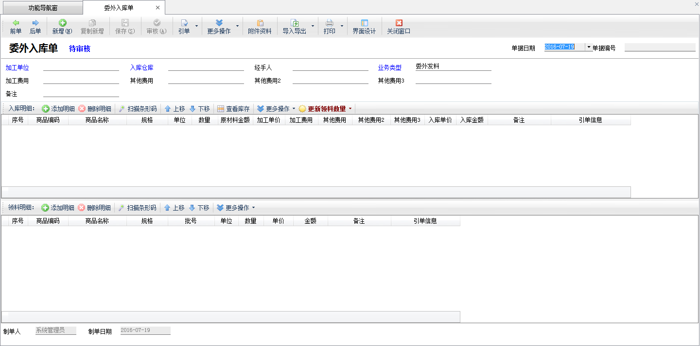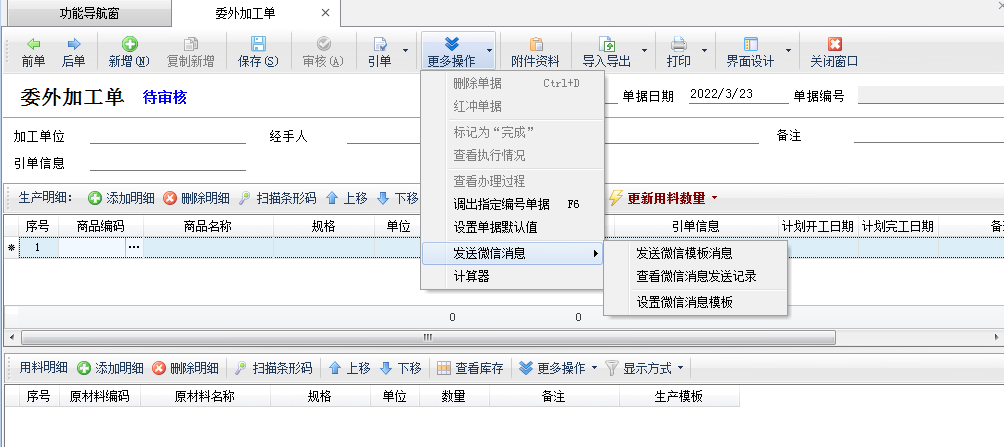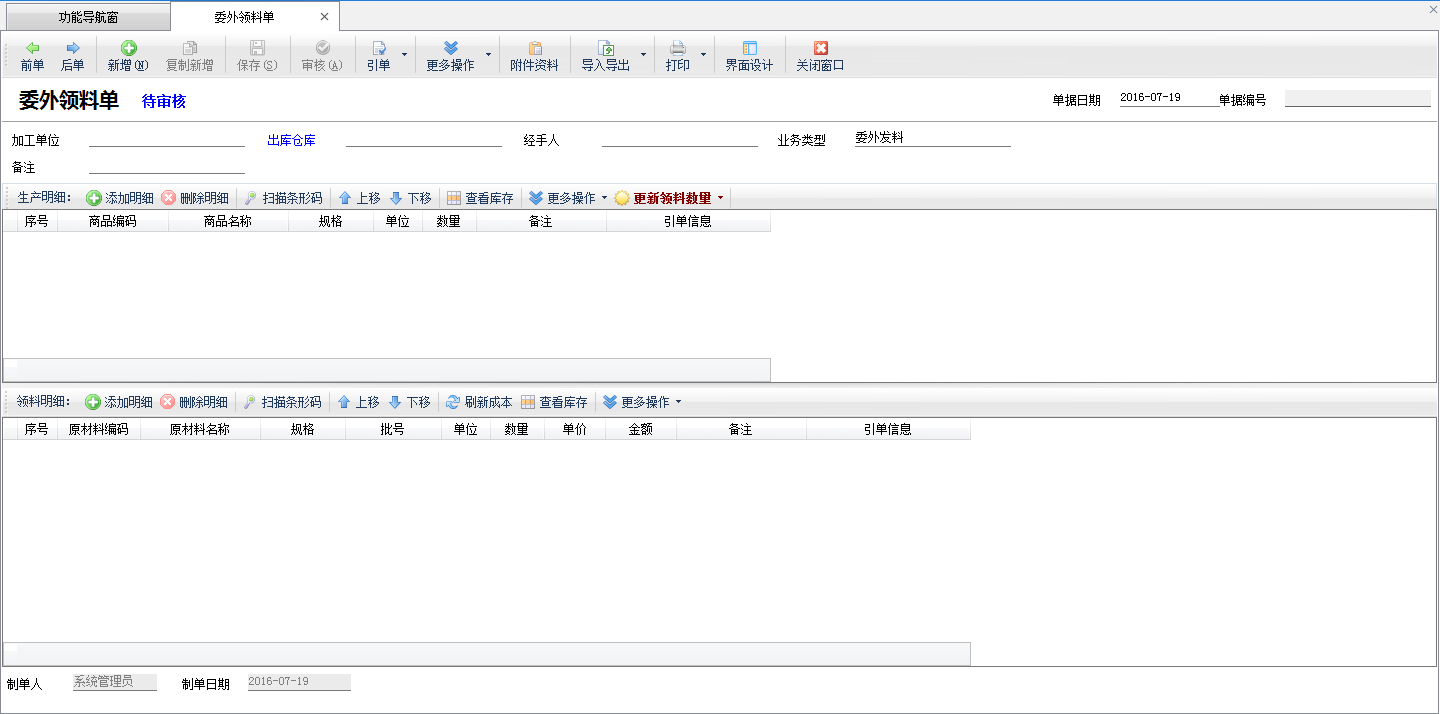 引單:委外領料單可以引用“委外加工單”,并將加工單中的產品明細作為單據的生產明細,同時如果相應的商品有生產模板則自動根據生產模板生成領料明細。