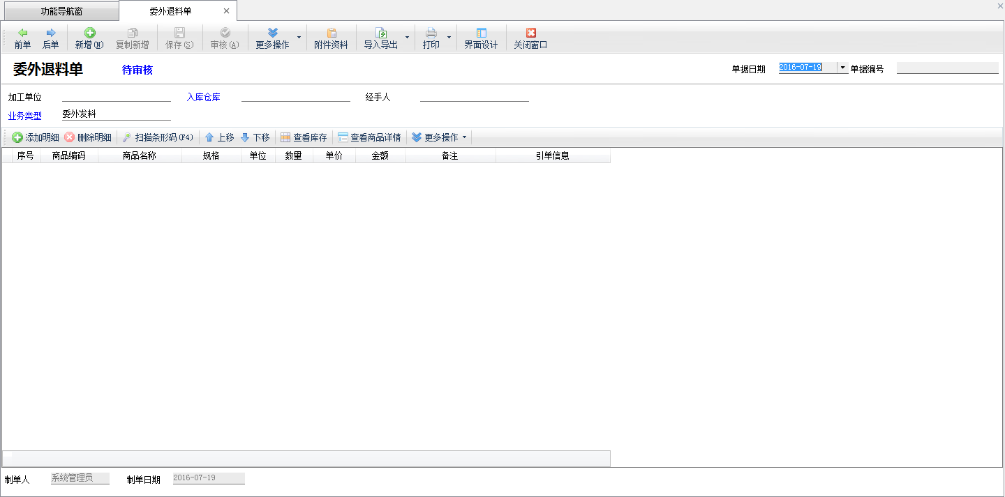 ????在功能導航窗,點“生產管理”—》“委外加工”—》“委外退料單”,即可進入委外退料單界面,如下圖所示: