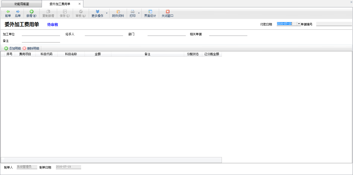 ????委外加工費用于管理委外加工過程中產生的各種費用,登記費用后可以將費用分攤到加工產品成本中,并自動生成應付款,支持與加工單位進行付款結銷(委外費用結算單)。