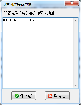 ????設置允許連接的客戶端網卡地址,每行一個網卡地址。客戶端的網卡地址可以在連接客戶端界面中點“復制客戶端網卡地址”進行復制,也可以在“網絡和共享中心”中 “本地連接狀態”的詳細信息查看到。
