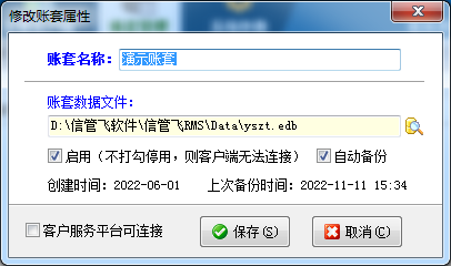 修改:修改賬套屬性時,如果有客戶端已登錄這個賬套,則需要先退出客戶端程序,然后再進行賬套屬性的修改。修改賬套屬性時,可以不啟用賬套(即停用),停用后的賬套客戶端程序無法連接;設置是否自動備份賬套,如果設置自動備份,并且系統參數設置中也啟用了賬套備份,則軟件會按照賬套備份參數中的時間間隔定期備份此賬套。