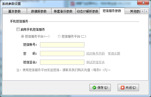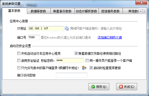????系統(tǒng)參數(shù)設(shè)置主要包括基本參數(shù)、數(shù)據(jù)庫(kù)參數(shù)、賬套備份參數(shù)、動(dòng)態(tài)IP解析參數(shù)、短信服務(wù)參數(shù)等。星光版由于支持單機(jī)版使用,因此沒(méi)有動(dòng)態(tài)IP解析參數(shù)設(shè)置功能。
